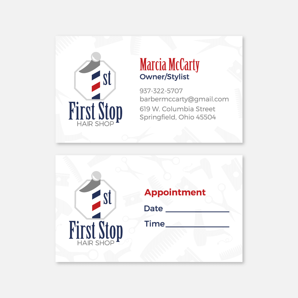 The client didn’t have specific requests for their logo or business card design. During the creative process, I thumbnailed multiple logo ideas but stuck with making a play on words of the business’s title “First Stop”. I used pencil and paper to draw my original concept shaping a barber’s pole into the number 1 and adding a stop sign shape behind it. I finalized my concept, chose a typeface, and added colors to match classic barber poles. For the business card, I used the same colors and style along with hair styling icons to pull together the design. Overall I wanted the logo and business card to display a creative, classic, and professional look.